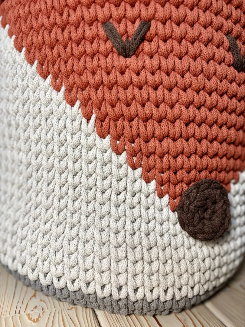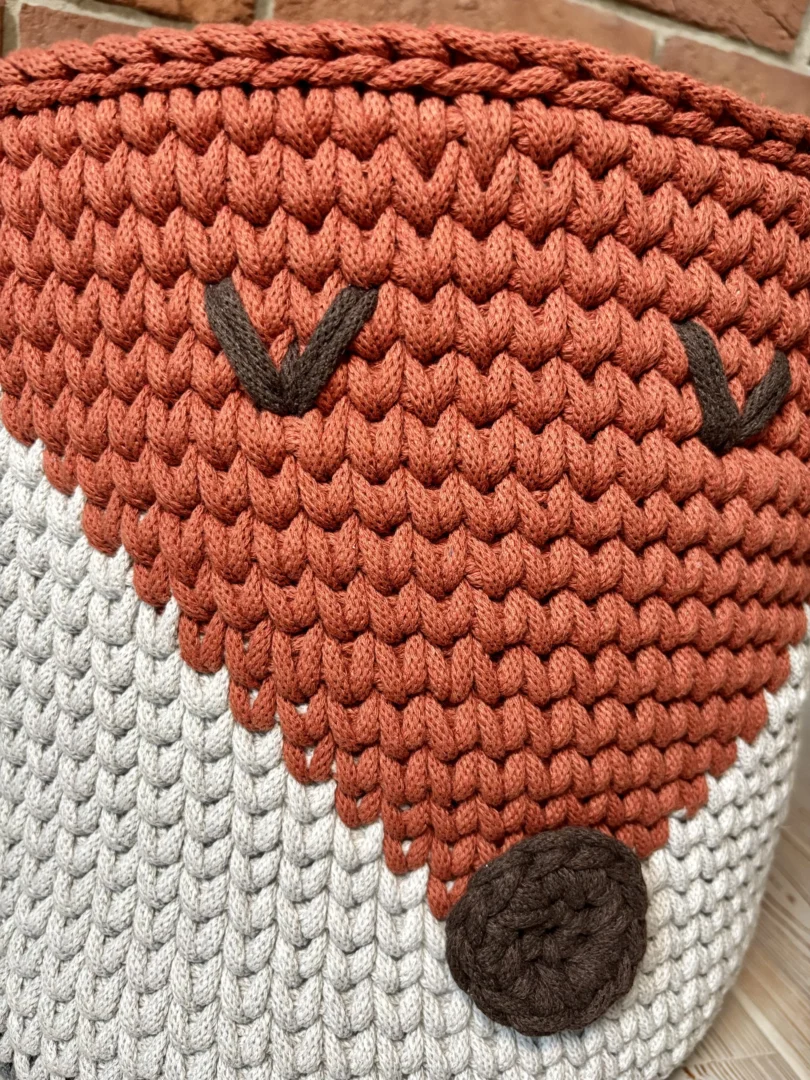 Kosz na zabawki Lisek to ręcznie wykonany kosz szydełkowy z grubego, bawełnianego sznurka 5 mm, zaprojektowany z myślą o porządkowaniu dziecięcej przestrzeni w estetyczny i funkcjonalny sposób. Sprawdza się jako kosz na zabawki, kocyki, poduszki lub pluszaki, a jednocześnie stanowi ciepły, dekoracyjny akcent w pokoju dziecka.