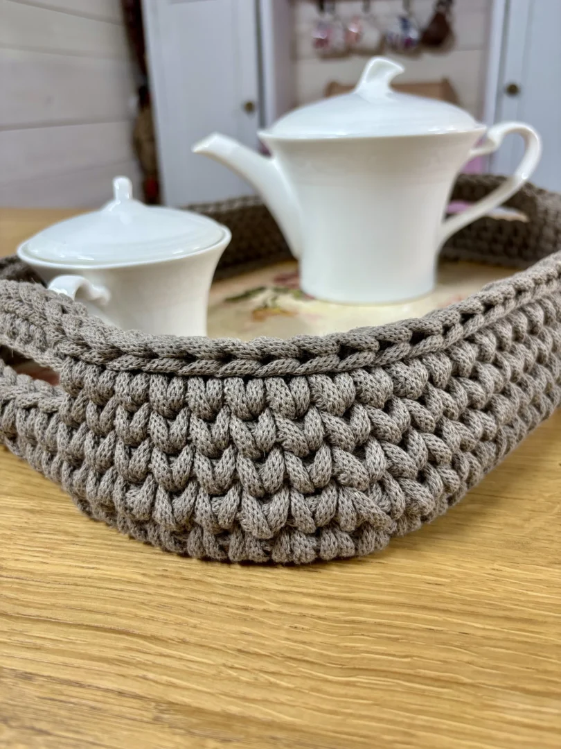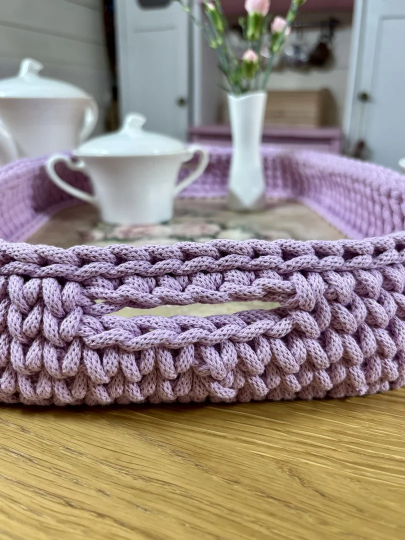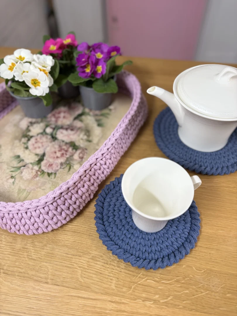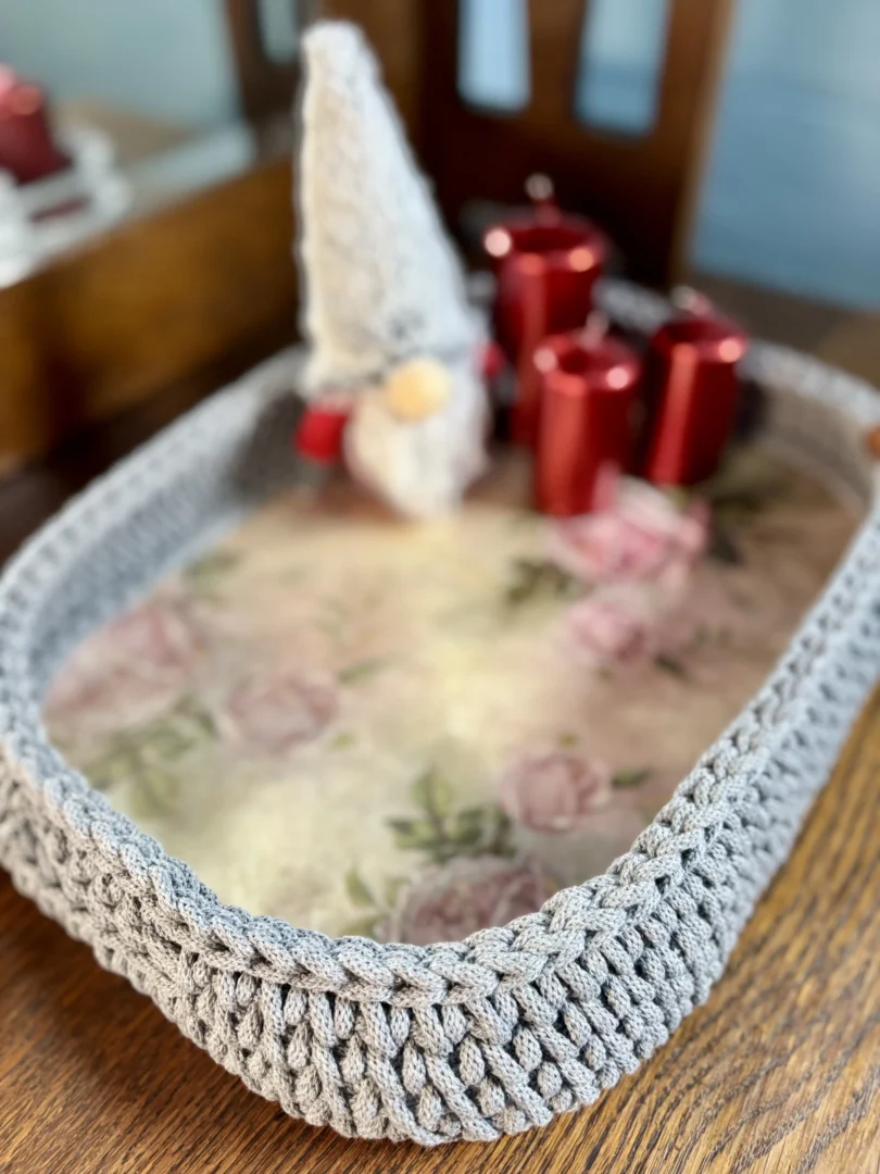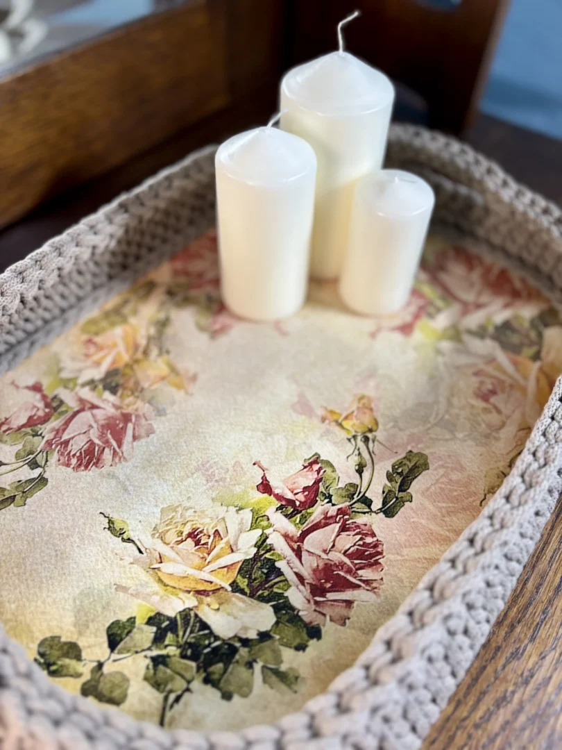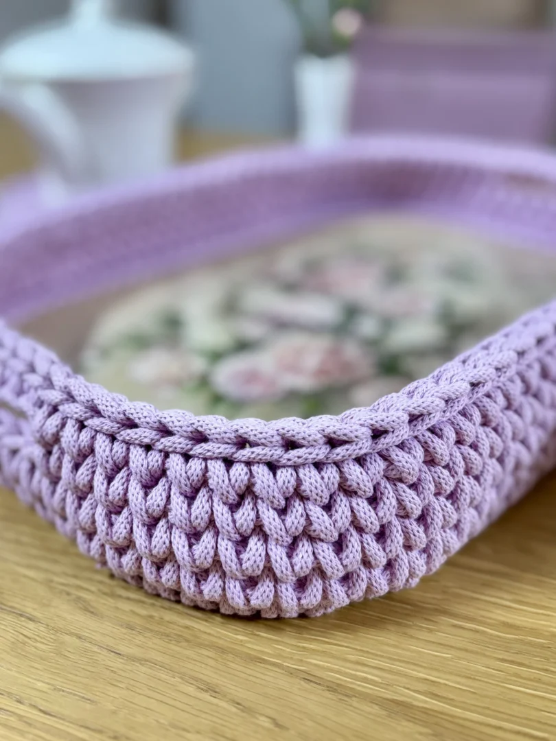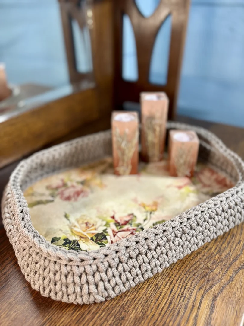 Najpierw tworzę ręcznie zdobione dno z motywami kwiatowymi. Wzór jest starannie zabezpieczany odpowiednimi lakierami, aby zachował trwałość i estetykę na długi czas. Następnie całość oszydełkowuję sznurkiem, dzięki czemu taca zyskuje miękką linię, strukturę i wyjątkowy wygląd.