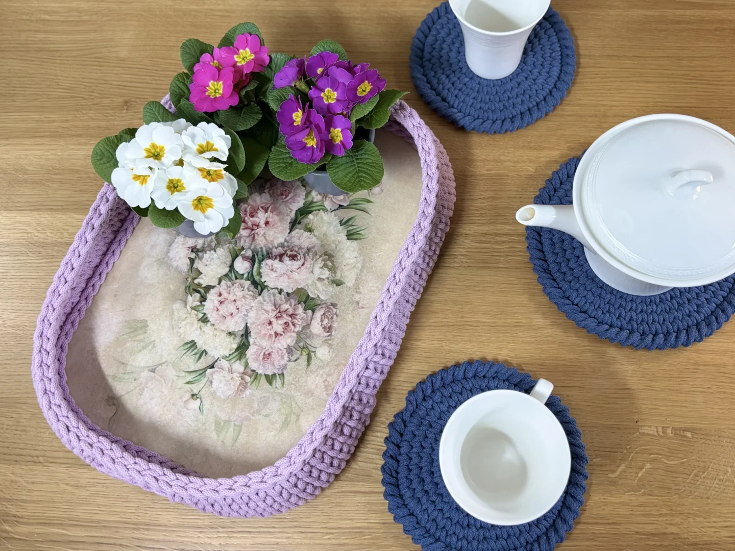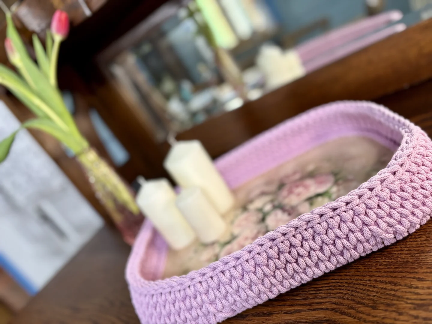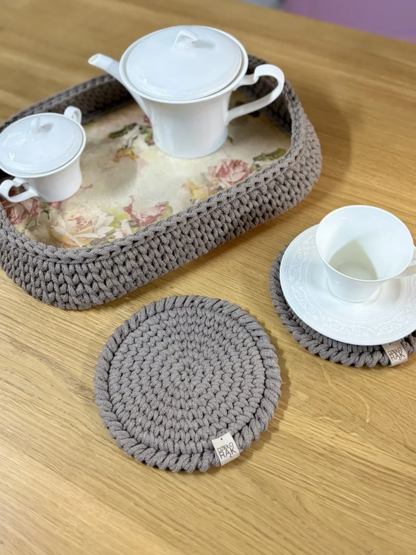 Ta taca powstaje specjalnie dla Ciebie. To Ty wybierasz motyw kwiatowy na dno oraz kolor sznurka, dzięki czemu tworzysz przedmiot dopasowany do swojego wnętrza i własnej estetyki. Każda taca jest jedyna w swoim rodzaju – i to właśnie stanowi jej największą wartość.