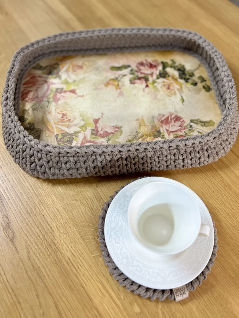 Taca handmade to autorska, ręcznie wykonana taca dekoracyjna, która łączy funkcję użytkową z wyjątkowym wyglądem. Ty wybierasz motyw kwiatowy na dno oraz kolor sznurka, dzięki czemu powstaje personalizowana taca idealnie dopasowana do Twojego wnętrza. Sprawdzi się zarówno jako taca do serwowania, jak i element dekoracyjny, który przyciąga wzrok i porządkuje przestrzeń.