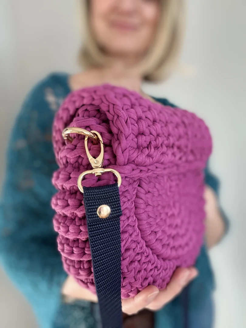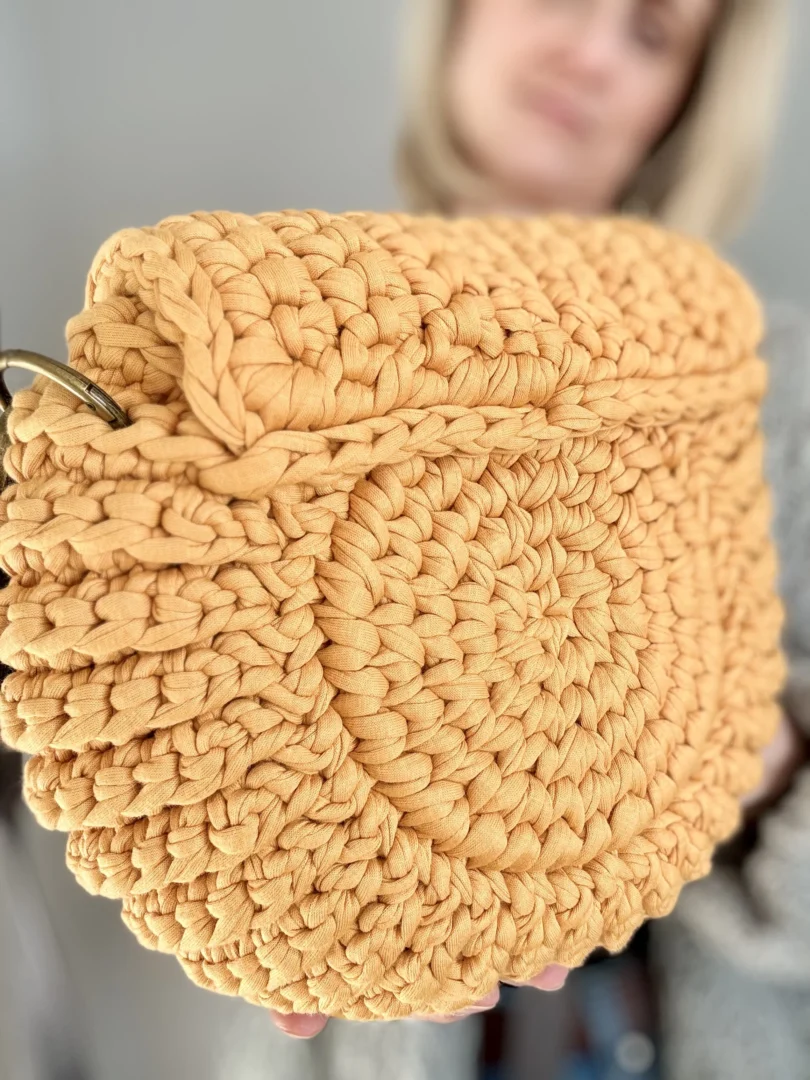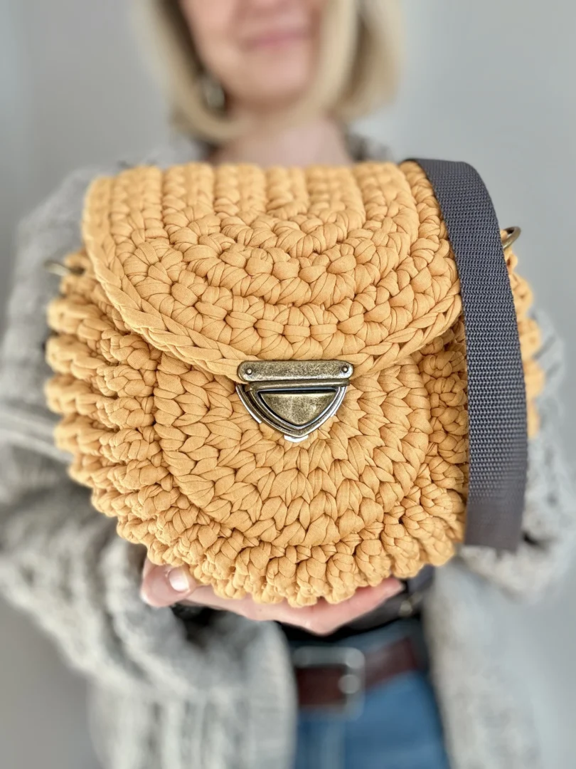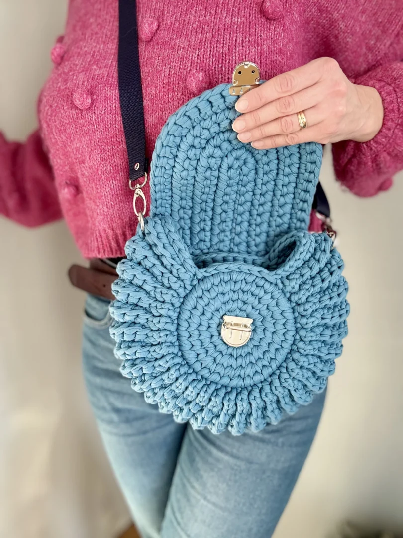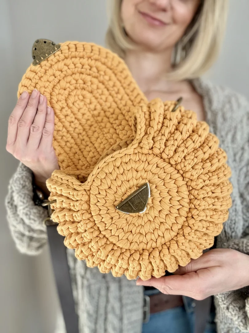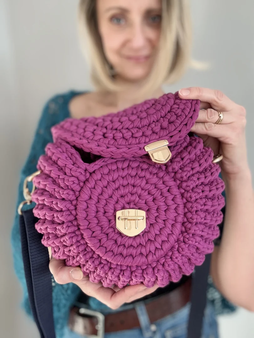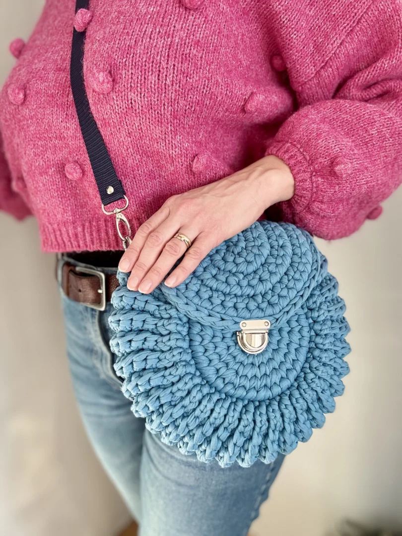 Torebka Oreo to ręcznie szydełkowana torebka z bawełnianego sznurka T-shirt. Okrągła forma, regulowany pasek i estetyczne metalowe zapięcie sprawiają, że to wygodny, uniwersalny dodatek na co dzień – tworzony na zamówienie, z dbałością o każdy detal.